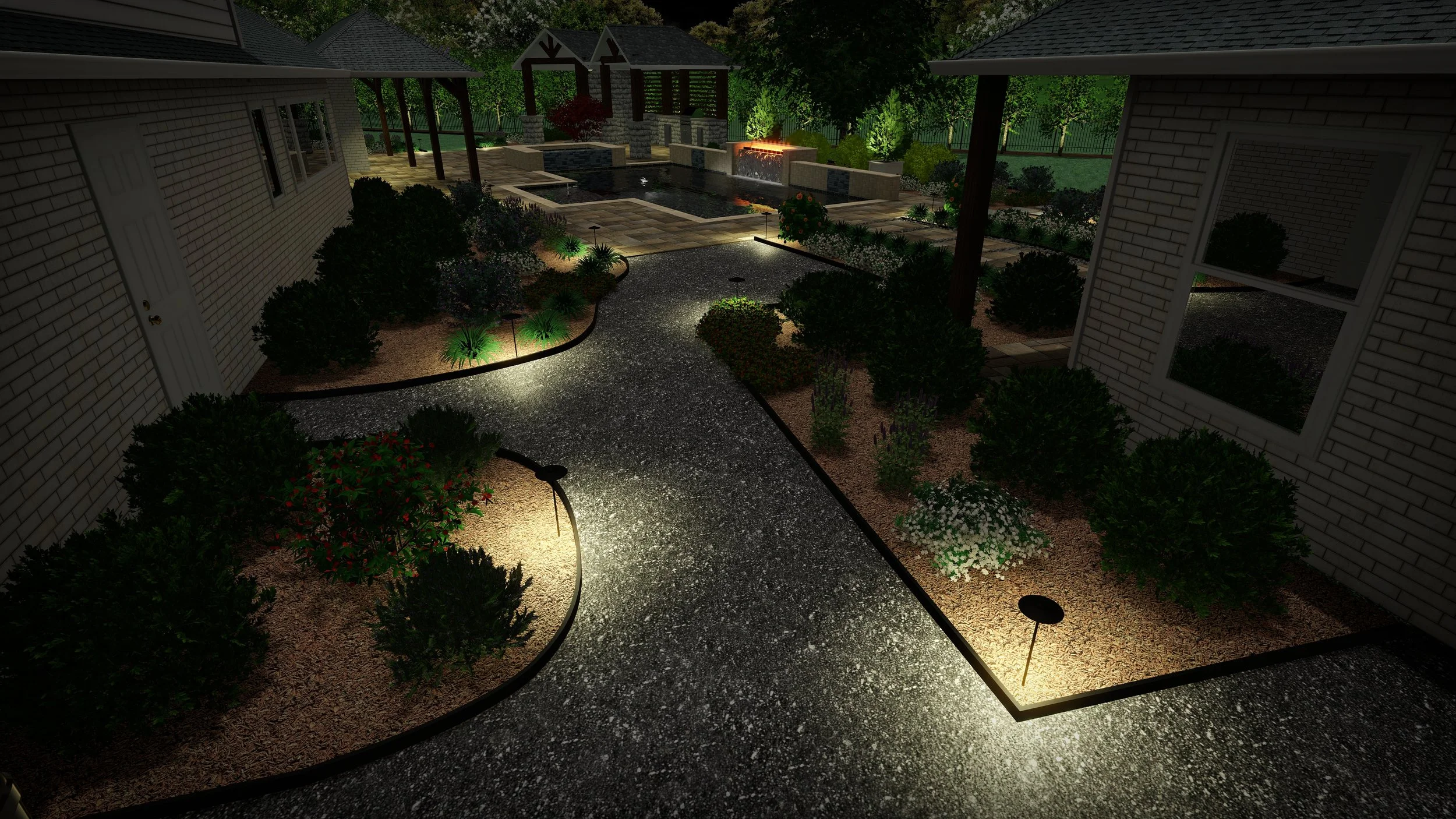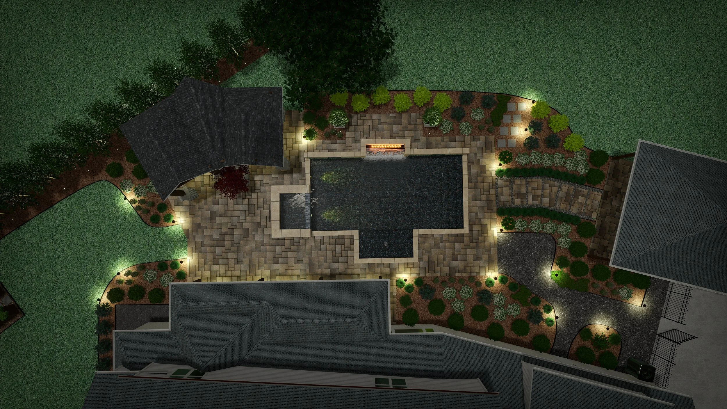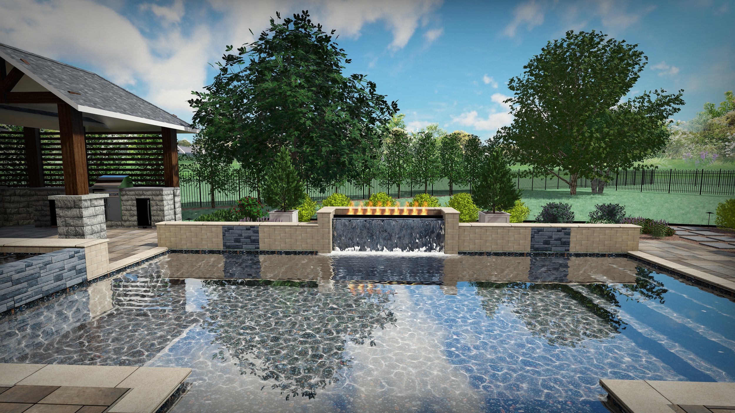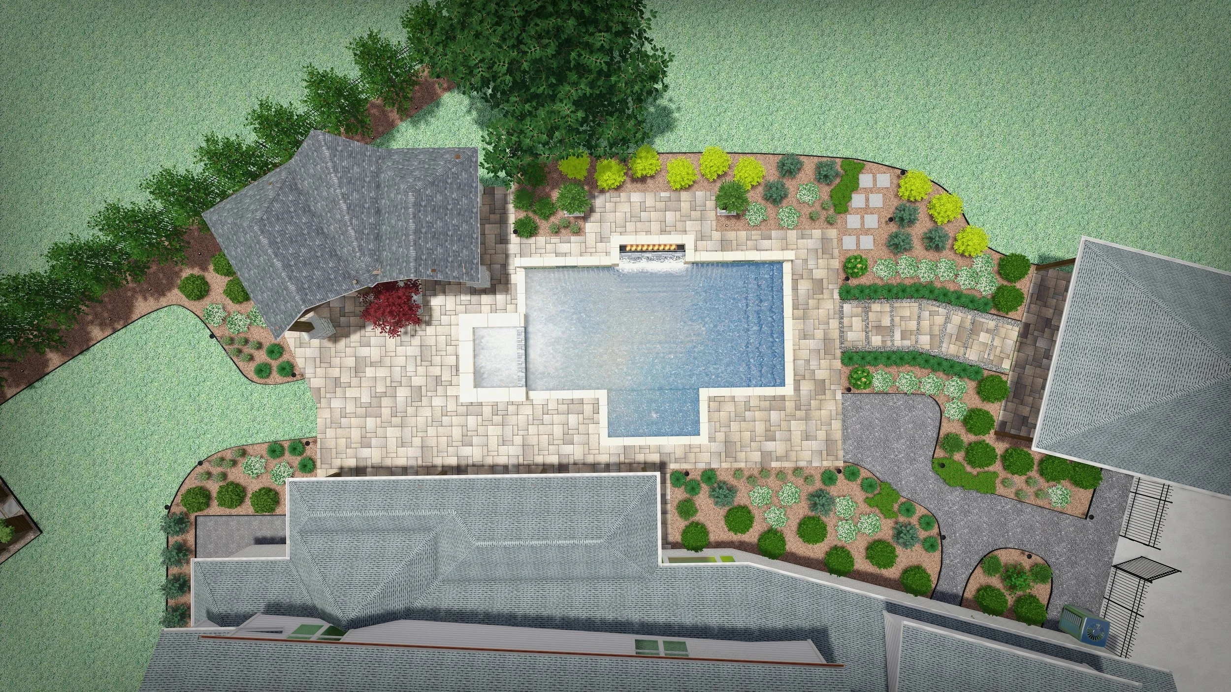 After completing a pool, outdoor kitchen, and pool house project, they needed a landscape design that gave their empty landscape life. Blending natural landscaping with contemporary hardscape, this design is meant to grow naturally with only seasonal trimming and cutbacks.